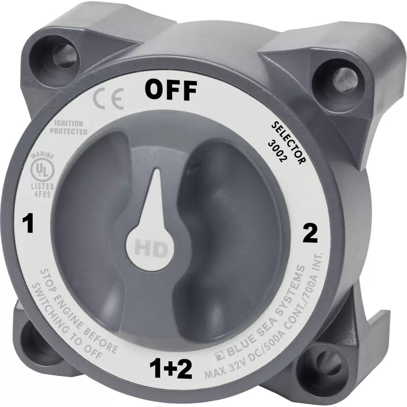 Le coupe-circuit BLUE SEA Heavy Duty 4 Positions accepte 500 A de courant en continu. Cet équipement électrique pour bateau vous permettra d’isoler ou combiné 2 parcs à batteries pour alimenter un circuit électrique, moteur, auxiliaire ou encore propulseur d’étrave.