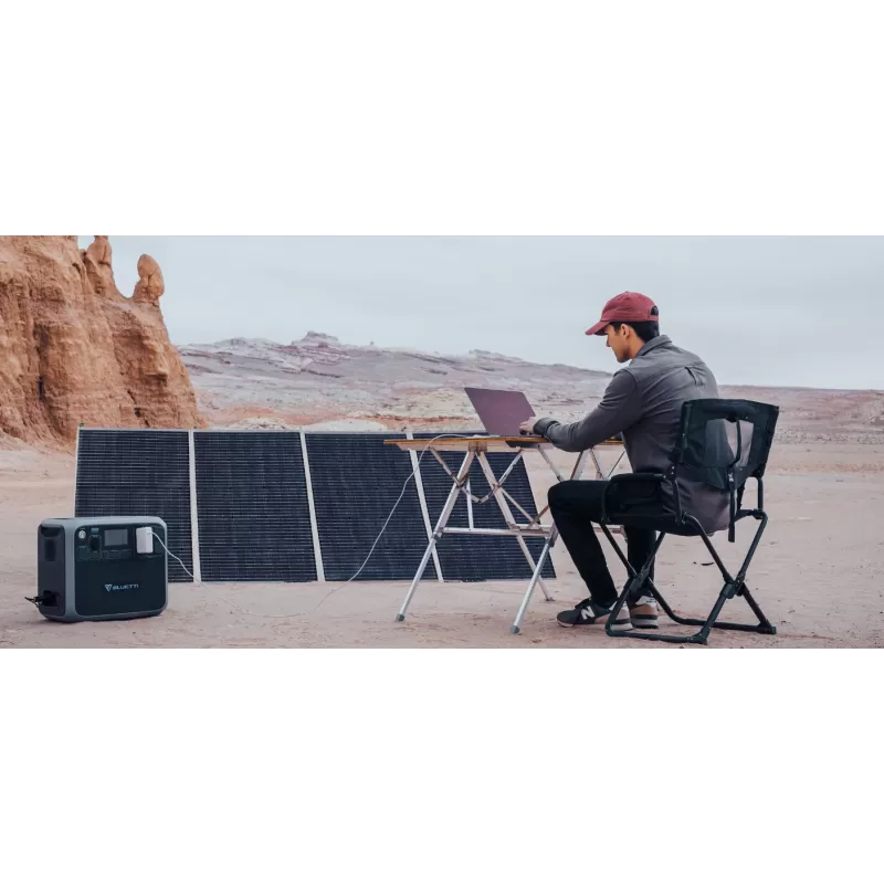 Le panneau solaire portatif BLUETTI 420 W est idéal pour la production d’énergie et la recharge facilement de votre batterie nomade. Ce panneau solaire est simple et rapide à installer. Connectez simplement le connecteur au générateur solaire, dépliez le panneau solaire et fixez le panneau sur son trépied. Le format valise facilite le transport et le stockage dans un bateau, un camping-car comme dans le van aménagé.
