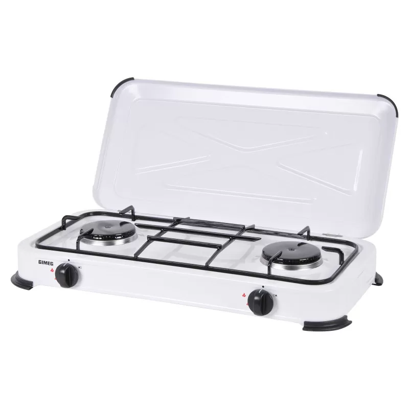 Réchaud à gaz avec couvercle et deux feux pour une utilisation à l’extérieur, ce modèle GIMEG convient pour le plein air : fourgon aménagé, caravane, camping ou camping-car.
