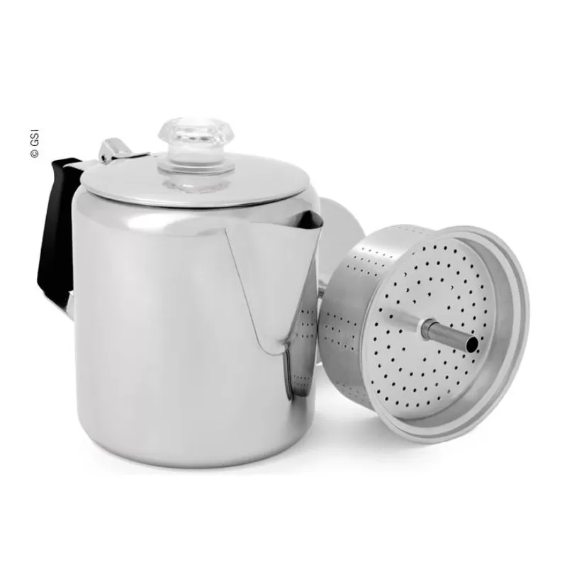 Cafetière italienne en acier inoxydable GSI OUTDOOR idéal pour se faire du bon café en randonnée, camping ou bateau et camping-car. Capacité de 900 ml.